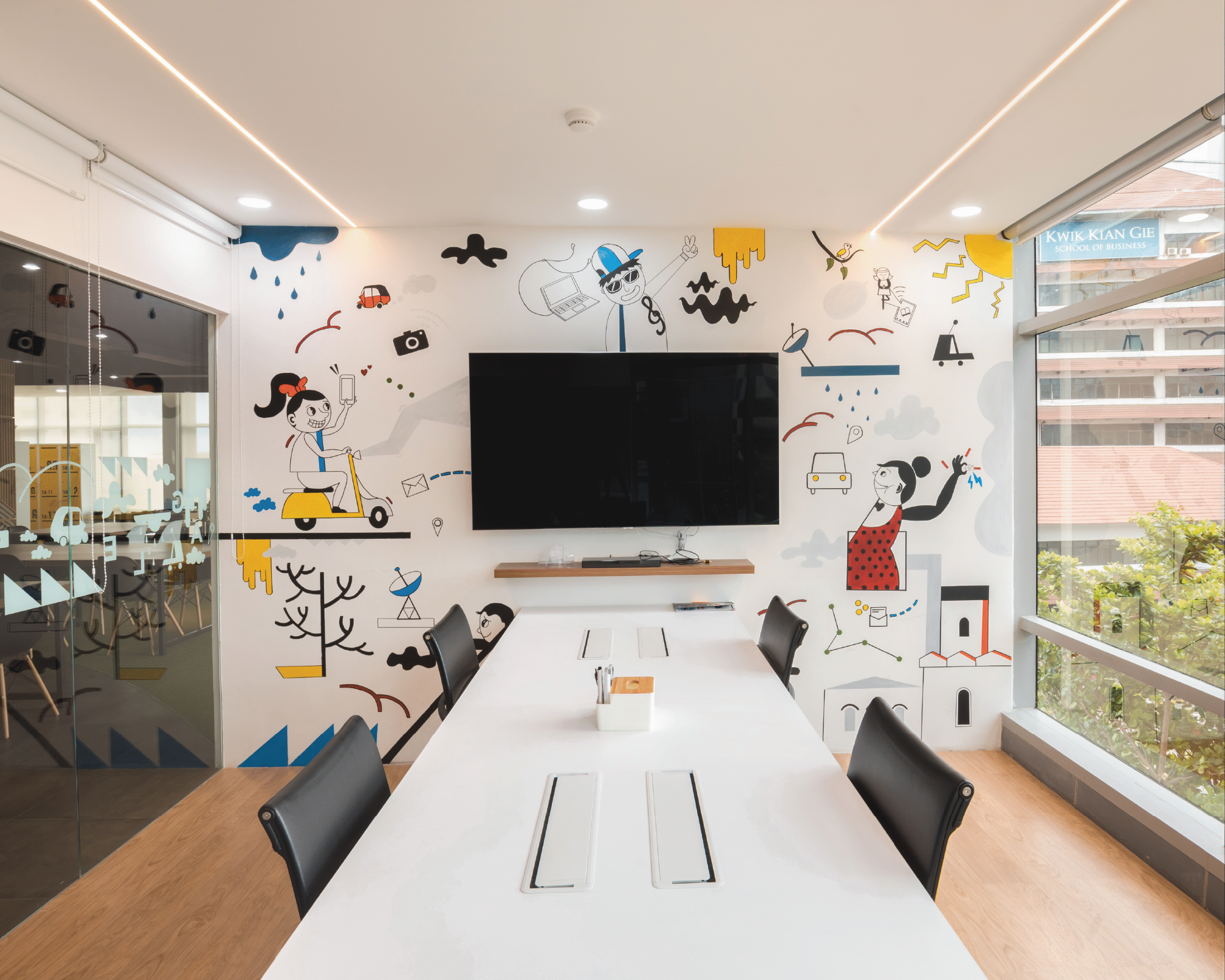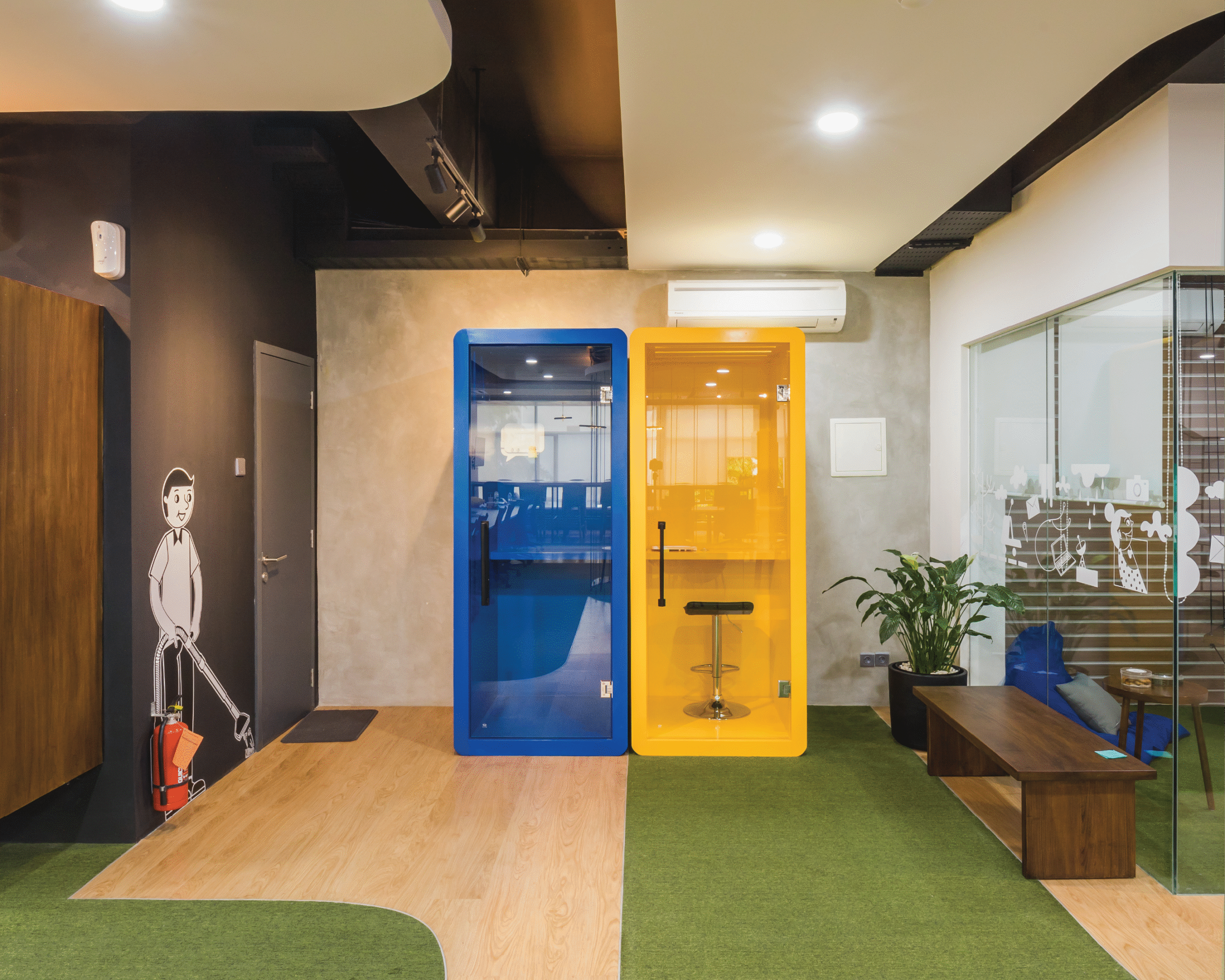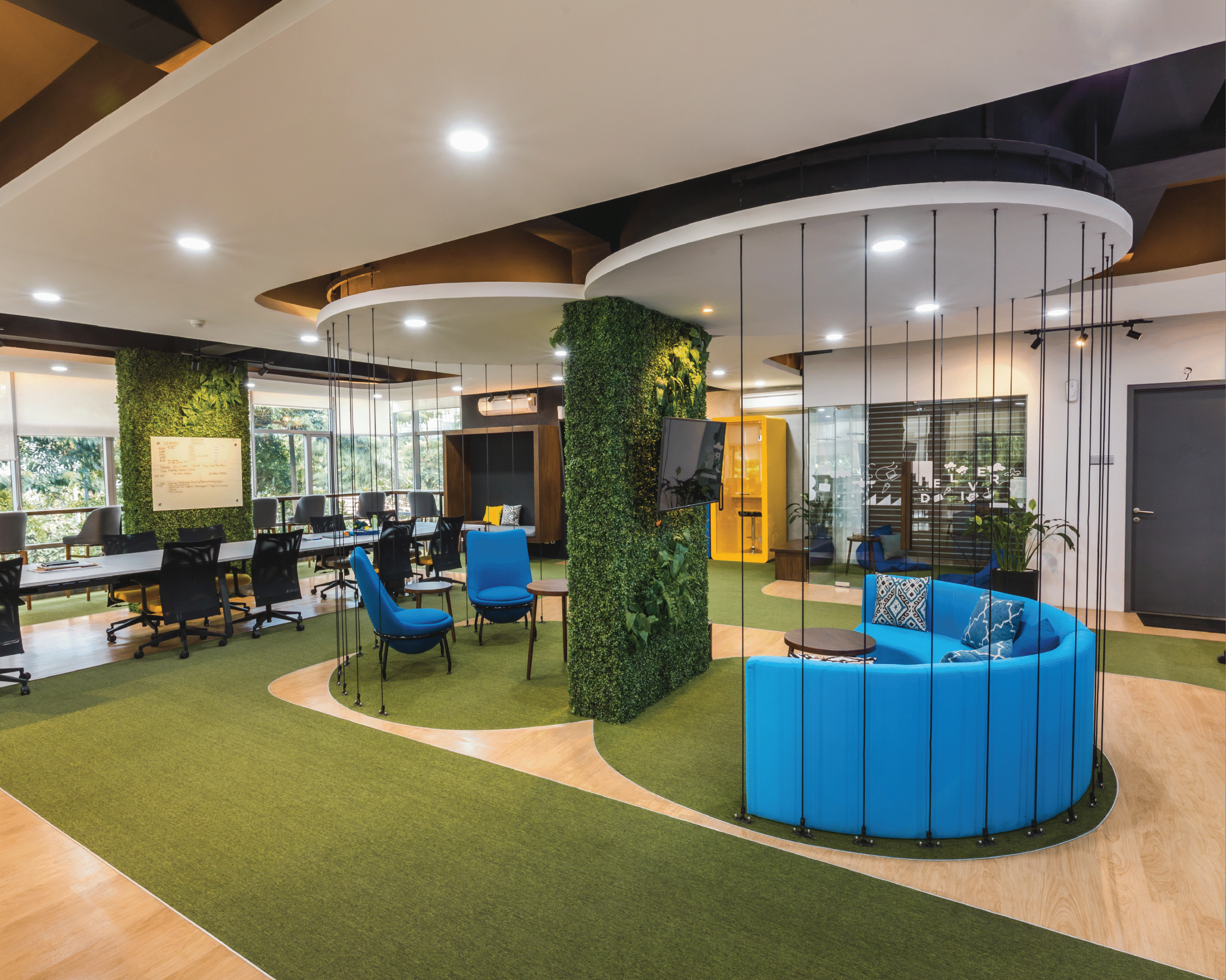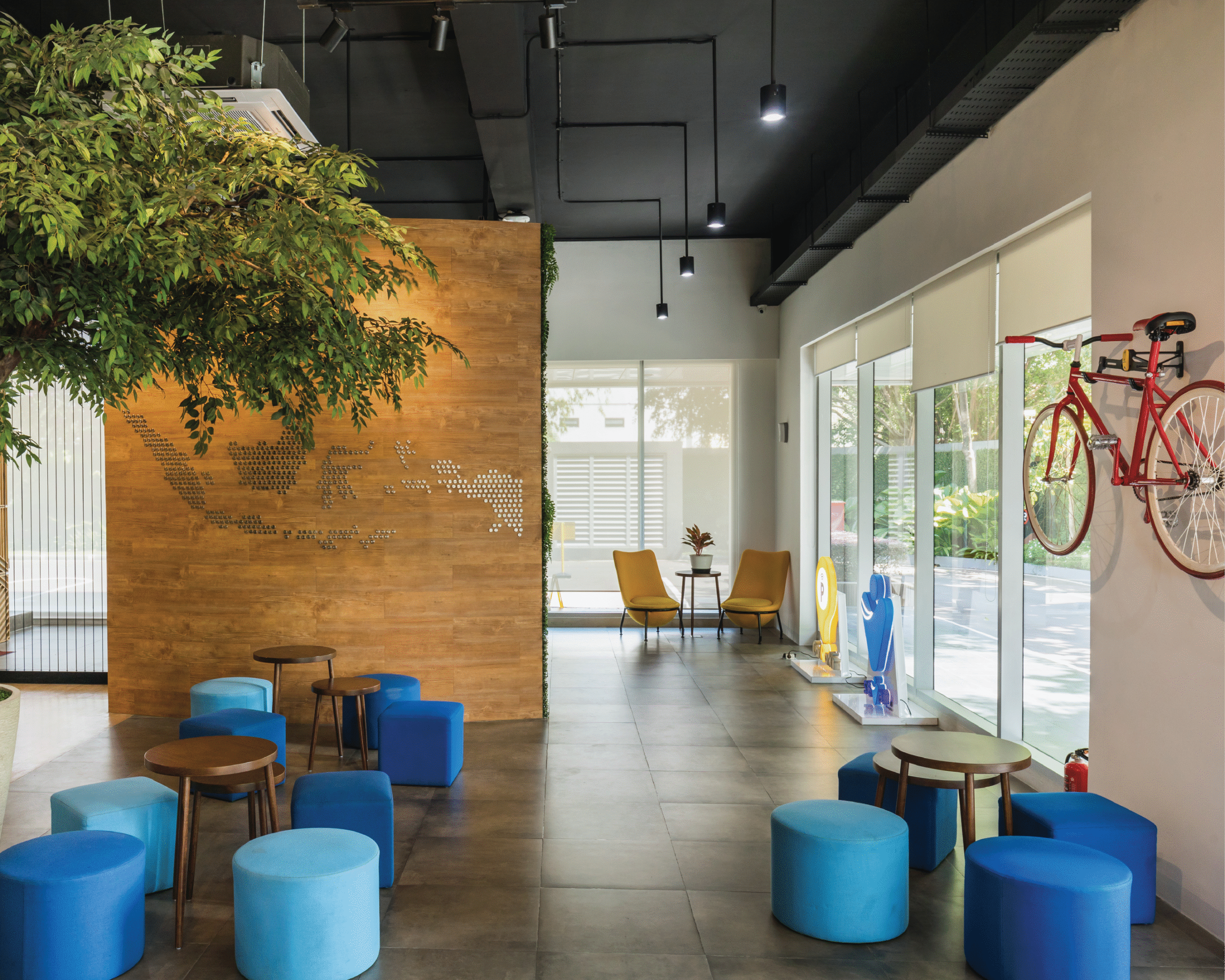 Palet warna vibrant menjadi elemen utama dalam menghadirkan energi positif di setiap lantai. Kombinasi warna kuning, biru, oranye, dan hijau dari tanaman menciptakan suasana kerja yang penuh semangat dan kolaboratif, menyerupai atmosfer kantor startup yang kreatif dan progresif. Setiap ruang dirancang fleksibel dan terbuka, mendukung interaksi serta inovasi yang menjadi inti budaya kerja digital di Indonesia masa kini.