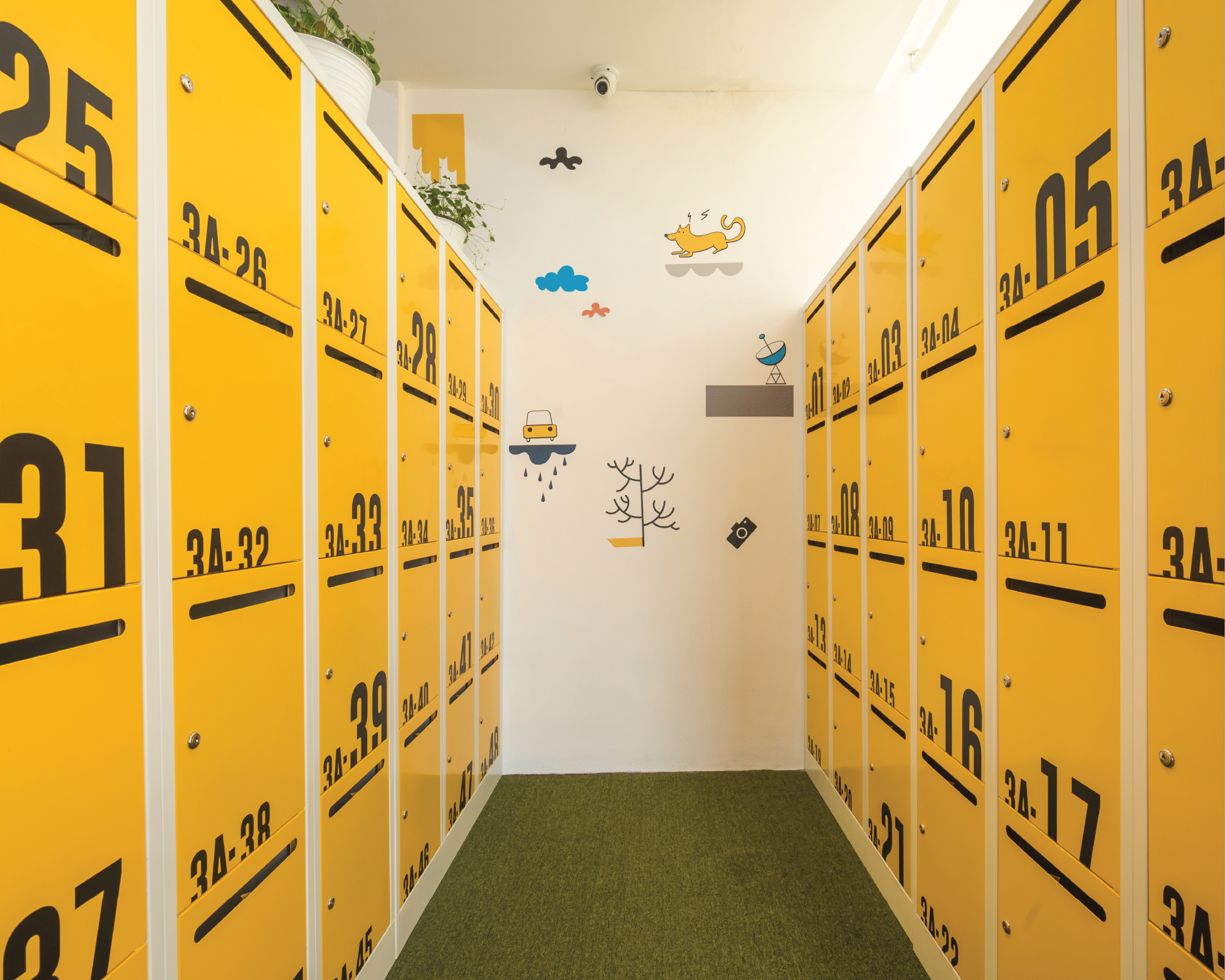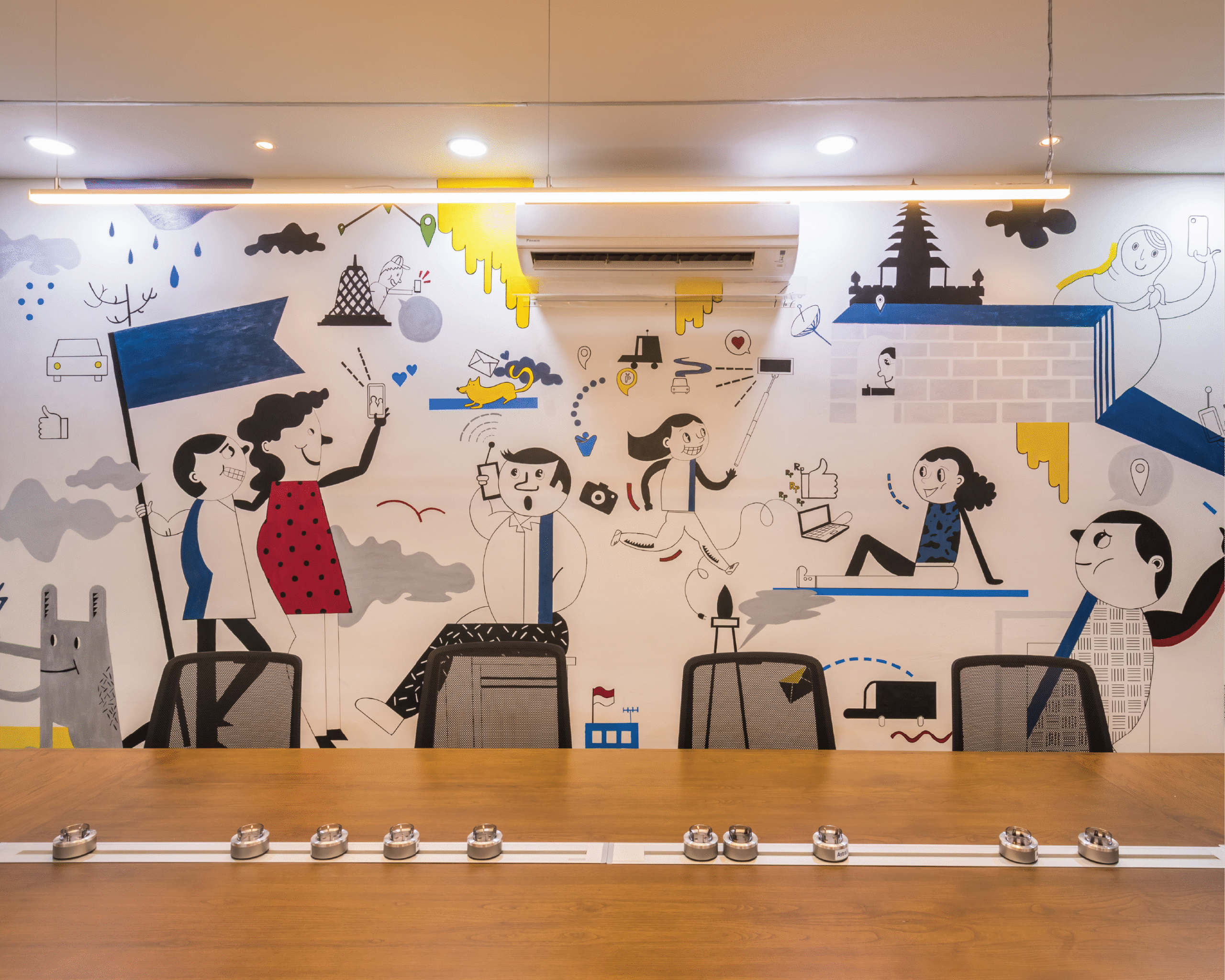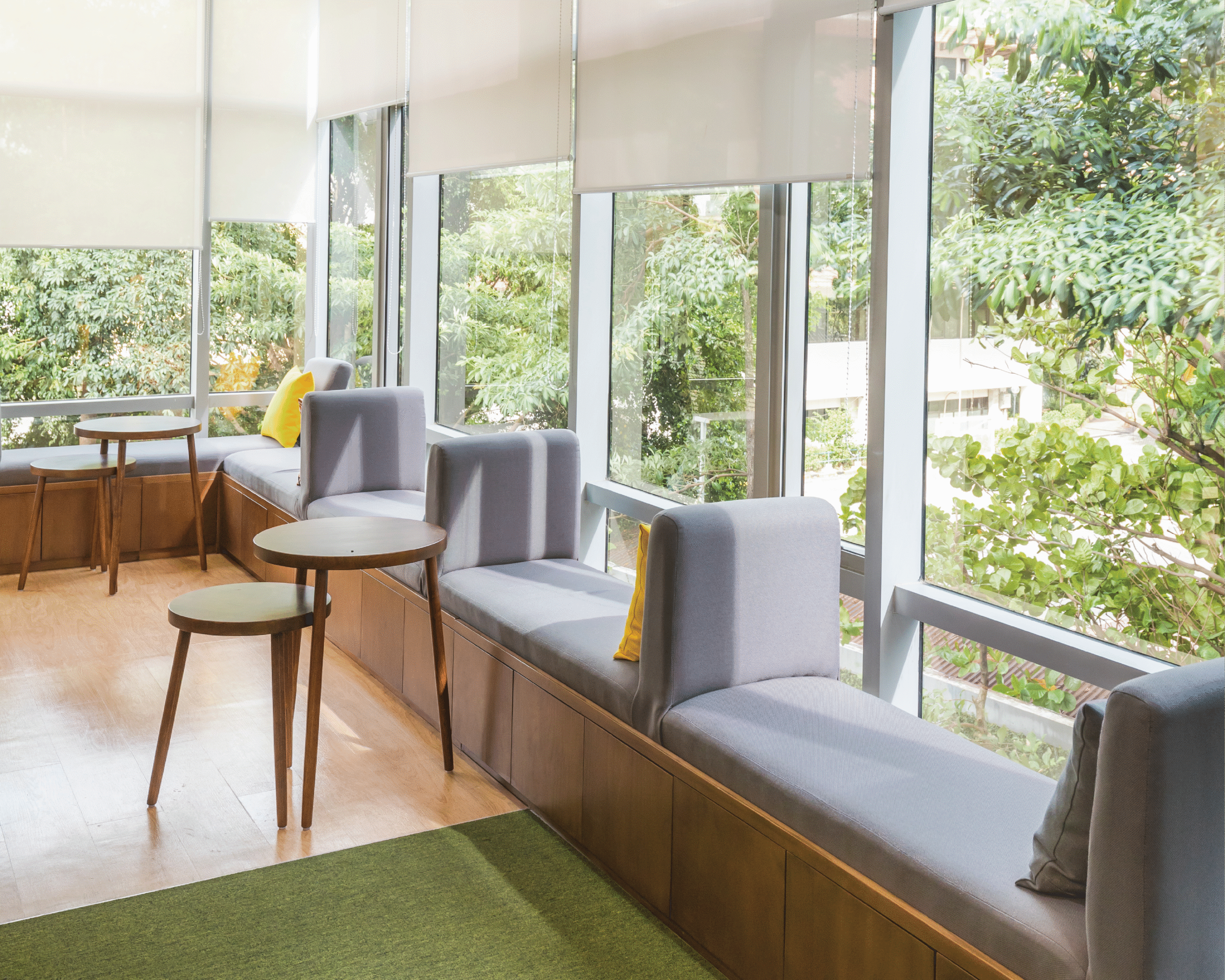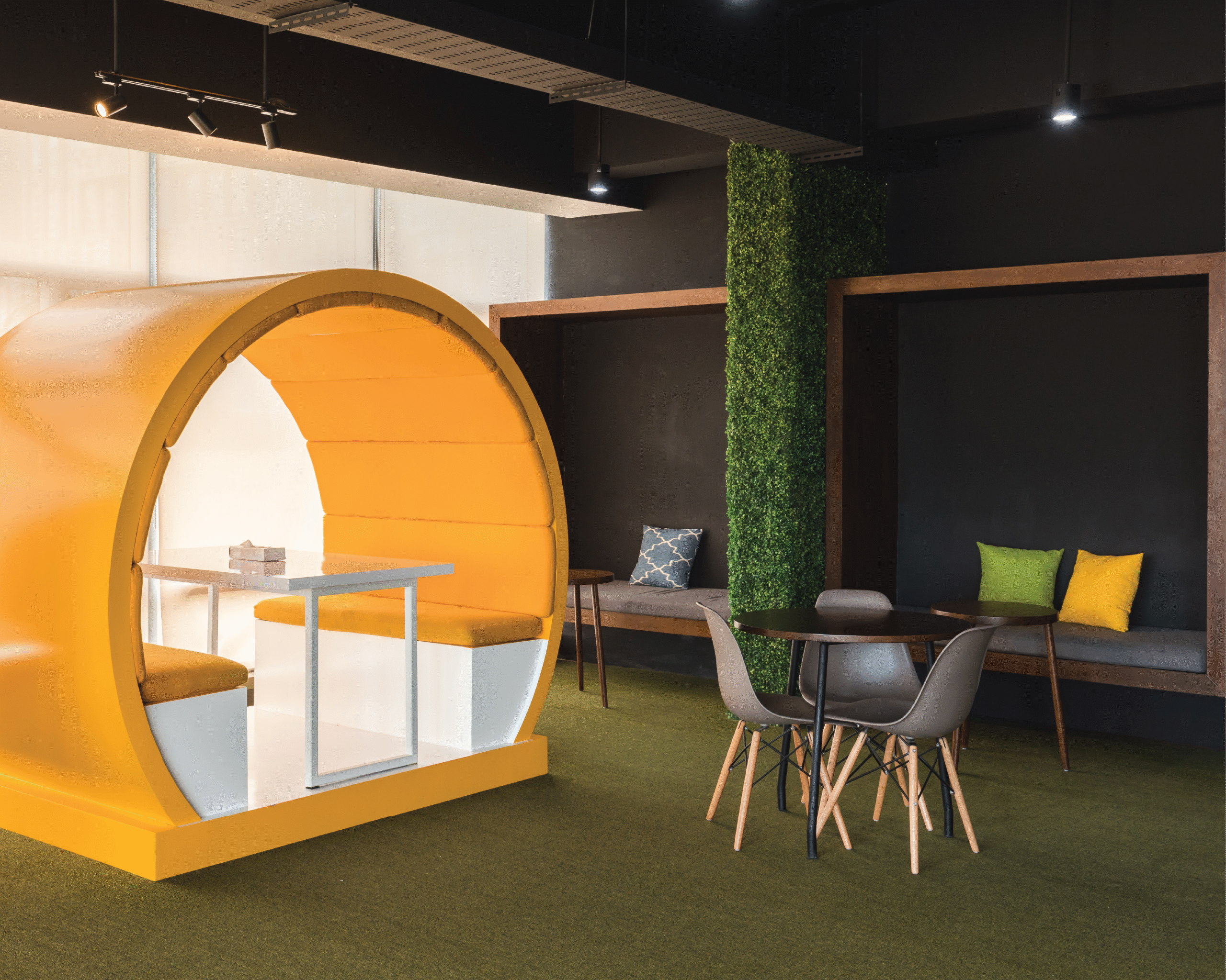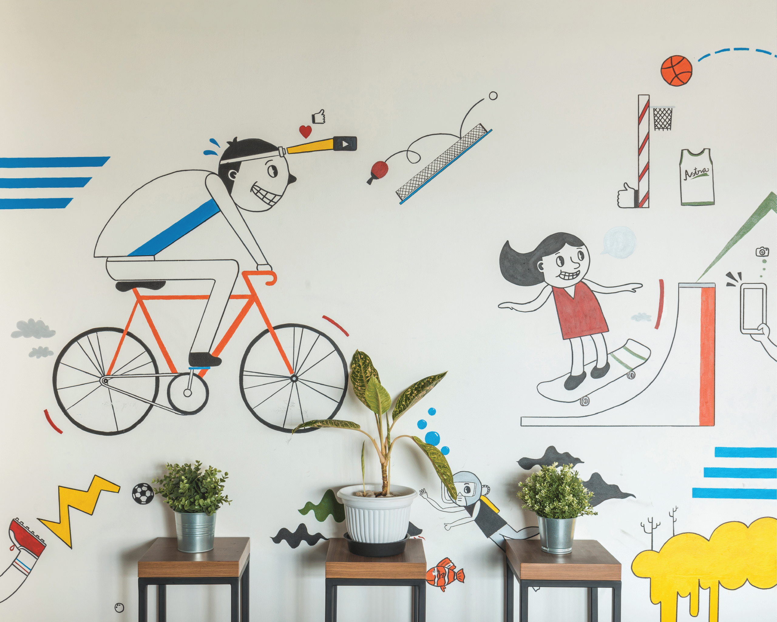 Palet warna vibrant menjadi elemen utama dalam menghadirkan energi positif di setiap lantai. Kombinasi warna kuning, biru, oranye, dan hijau dari tanaman menciptakan suasana kerja yang penuh semangat dan kolaboratif, menyerupai atmosfer kantor startup yang kreatif dan progresif. Setiap ruang dirancang fleksibel dan terbuka, mendukung interaksi serta inovasi yang menjadi inti budaya kerja digital di Indonesia masa kini.